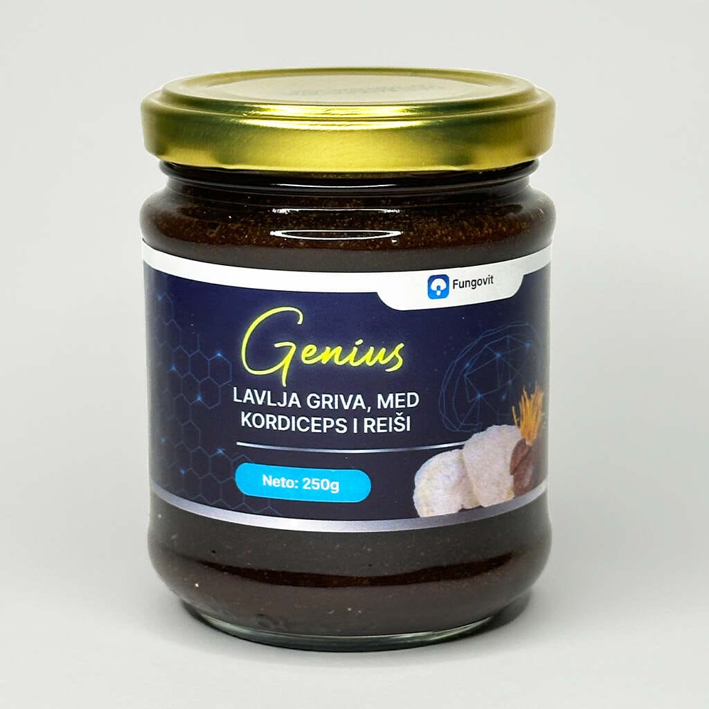 Für wen ist Genius geeignet? Dieses kraftvolle Produkt ist ideal für alle, die geistig gefordert sind – ob im Beruf, beim Studium oder im Alltag. Gleichzeitig wird Genius auch Menschen empfohlen, die unter Gedächtnisproblemen oder Demenz leiden, da es Pilze enthält, die das Wachstum von Nervenzellen (Nerve Growth Factor) unterstützen. Anwendung und empfohlene Tagesdosis: Täglich einen Teelöffel morgens, etwa 30 Minuten vor dem Frühstück, einnehmen. Geschmack: Die natürliche Kombination aus Honig und diesen besonderen „smarten“ Pilzen sorgt für einen angenehm schokoladigen Geschmack. Verpackungseinheit: 250 Gramm – ausreichend für 25 Tage. Zutaten: Ein 10-Gramm-Teelöffel enthält 9 g Honig, 0,6 g Lion’s…
